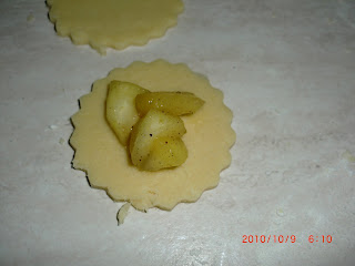 Su ogni disco mettere un cucchiaino colmo di mele e ricoprirlo con un altro disco leggermente più grande.